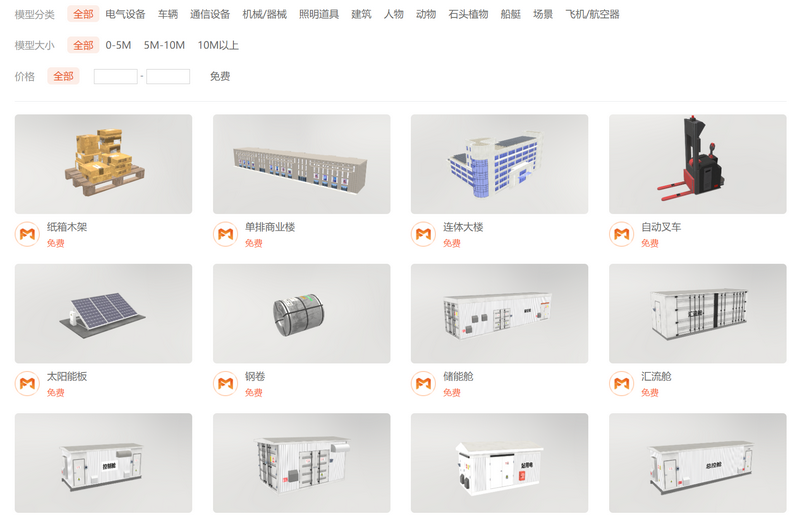 平台资源库涵盖工业设施、生产设备、标准产品、零部件等多种类型,方便用户按照需求进行快速调用。同时平台也为企业用户和三维模型创作者搭建了在线交易平台,协同构建资源库生态圈,打造更多应用场景。