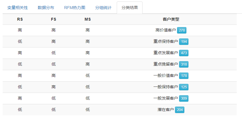 RFM模型是衡量客户价值和客户创利能力的重要工具和手段,该模型通过客户的近期交易行为、交易的总体频率以及交易金额三项指标来描述客户的价值状况,依据这三项指标划分8类客户价值。
