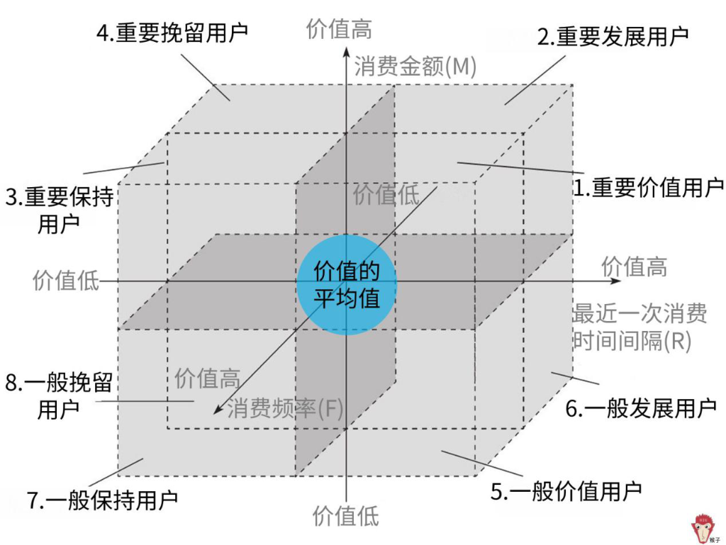 最近一次消费时间间隔(R),上一次消费离得越近,也就是R的值越小,用户价值越高。消费频率(F),购买频率越高,也就是F值越大,用户价值越高。消费金额(M),消费金额越高,也就是M值越大,用户价值越高。具体实际业务中,如何定义打分的范围,要根据具体的业务来灵活定,没有统一的标准。