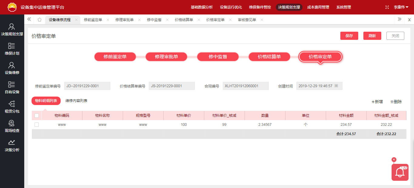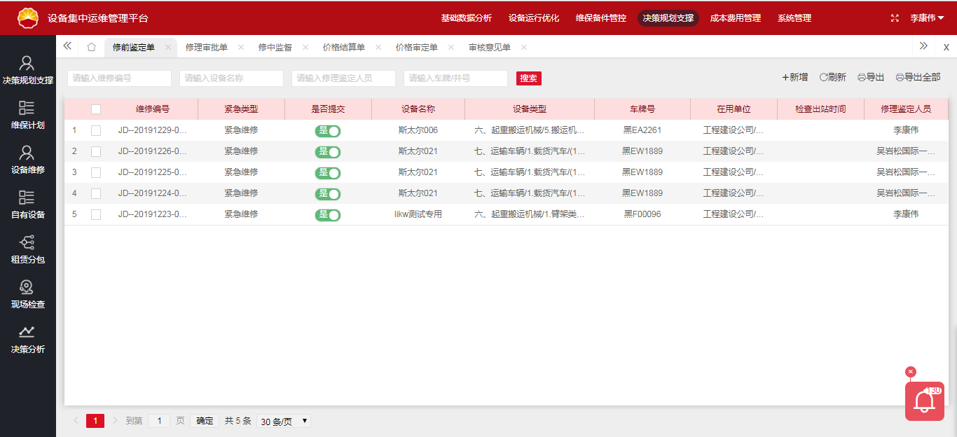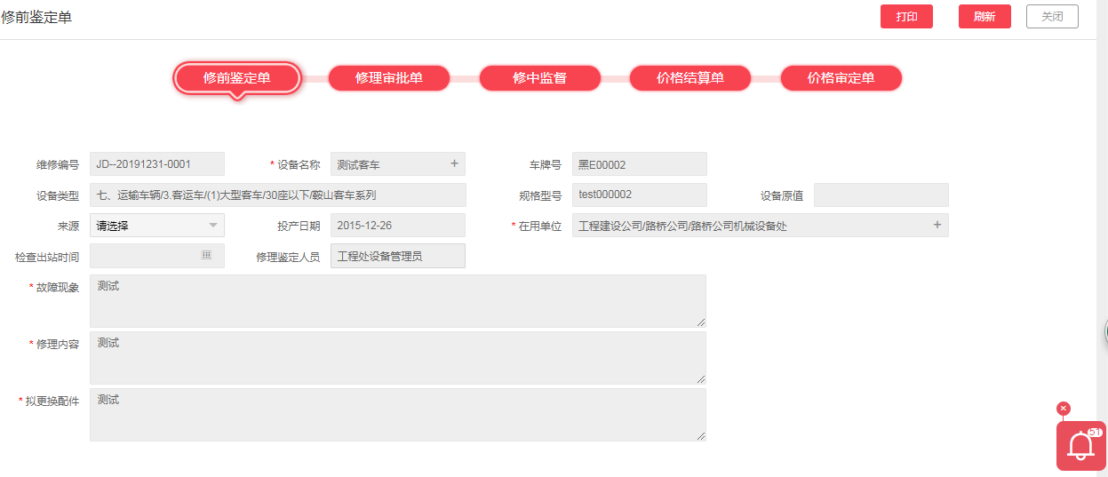 设备维修流程的第一步,设备来维修需要填写的第一个单子,从检查站或者冬季维保计划可以自动生成修前鉴定单,根据情况也可以直接新建,视为紧急维修;点击下一步进行修理审批,会将是否提交置为是,且只能提交一次,并生成修理审批单;支持搜索、新增、打印等功能。