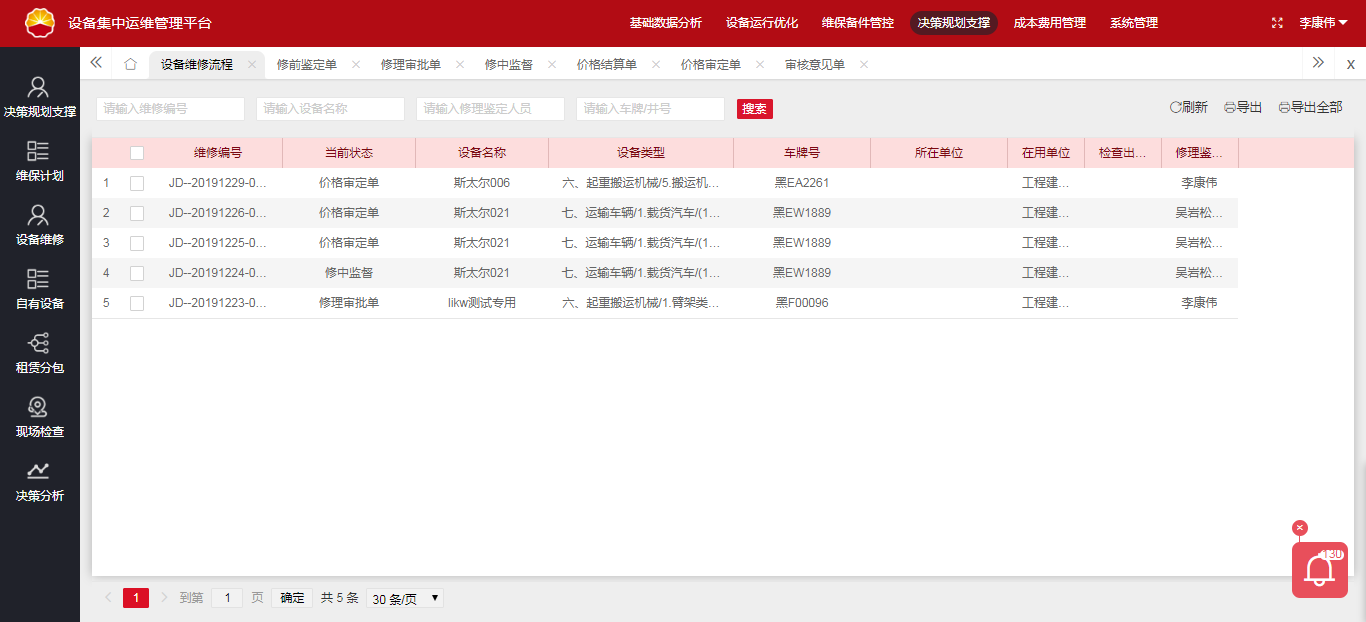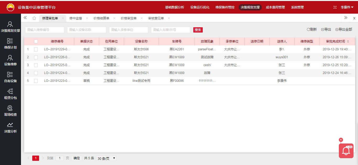 展示设备在维修过程中的生成的单子,可以查看设备的维修详情,支持搜索、导出等功能。