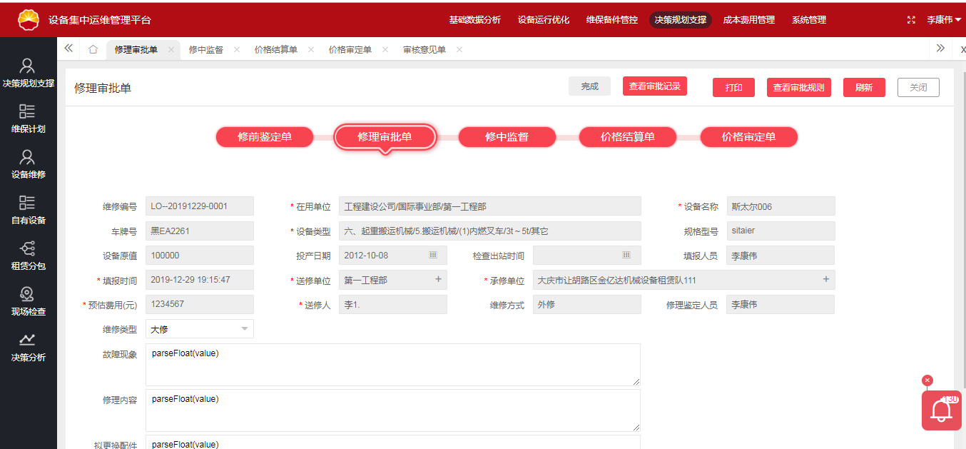 需要领导审批,审批完成自动生成修中监督单,审批根据预估费用走不同的流程,支持对编号,设备名称等模糊查询。